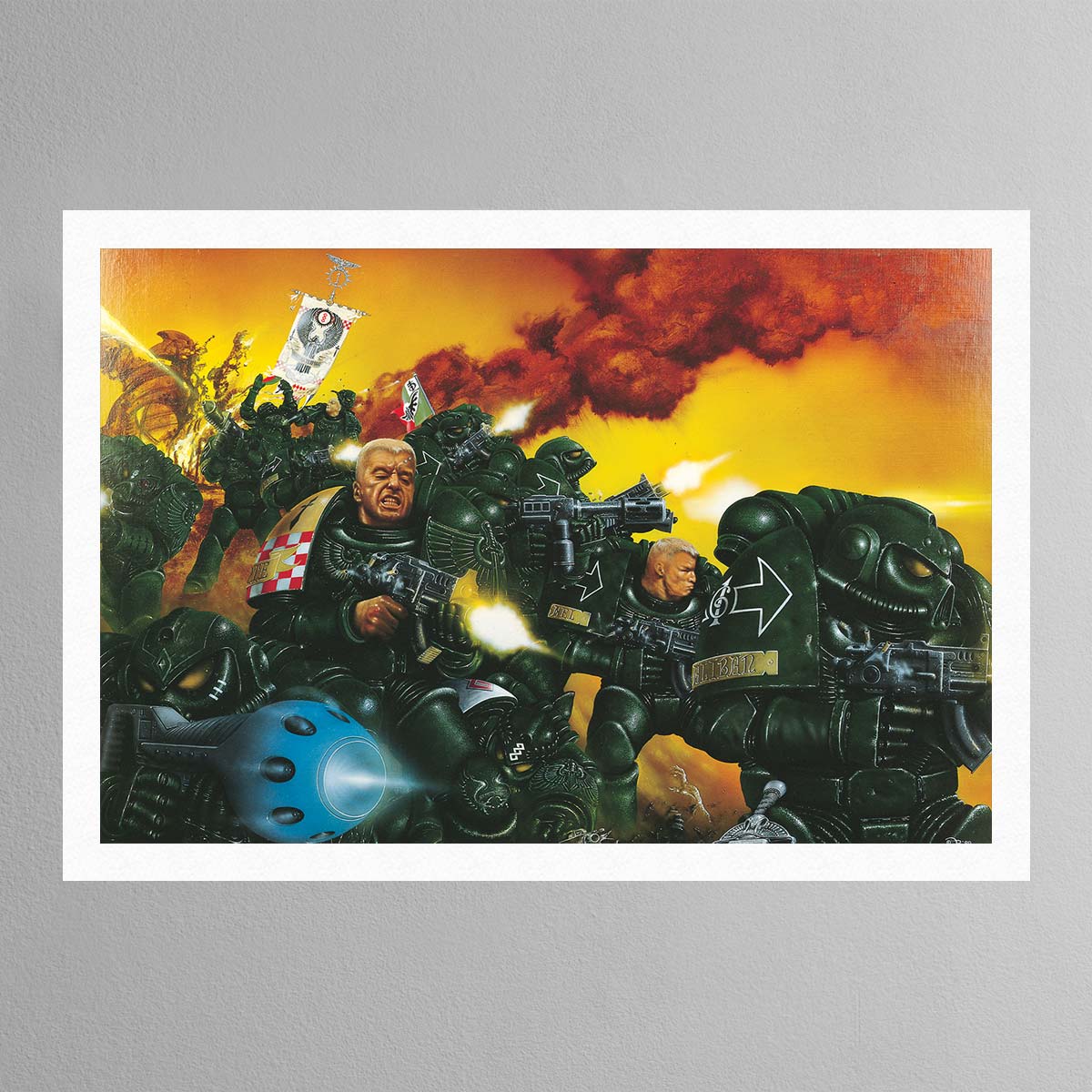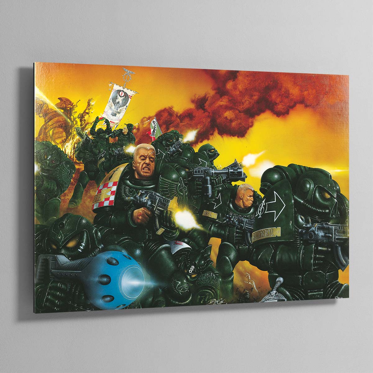 Originally the box art for the game ‘Space Marine’ in 1989, this dynamic vision shows Space Marines in a brutal firefight. In the early ’90s, this art was used by Warhammer Records as the cover for the album ‘Oblivion’ by D-Rok.