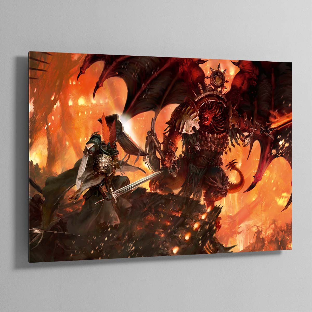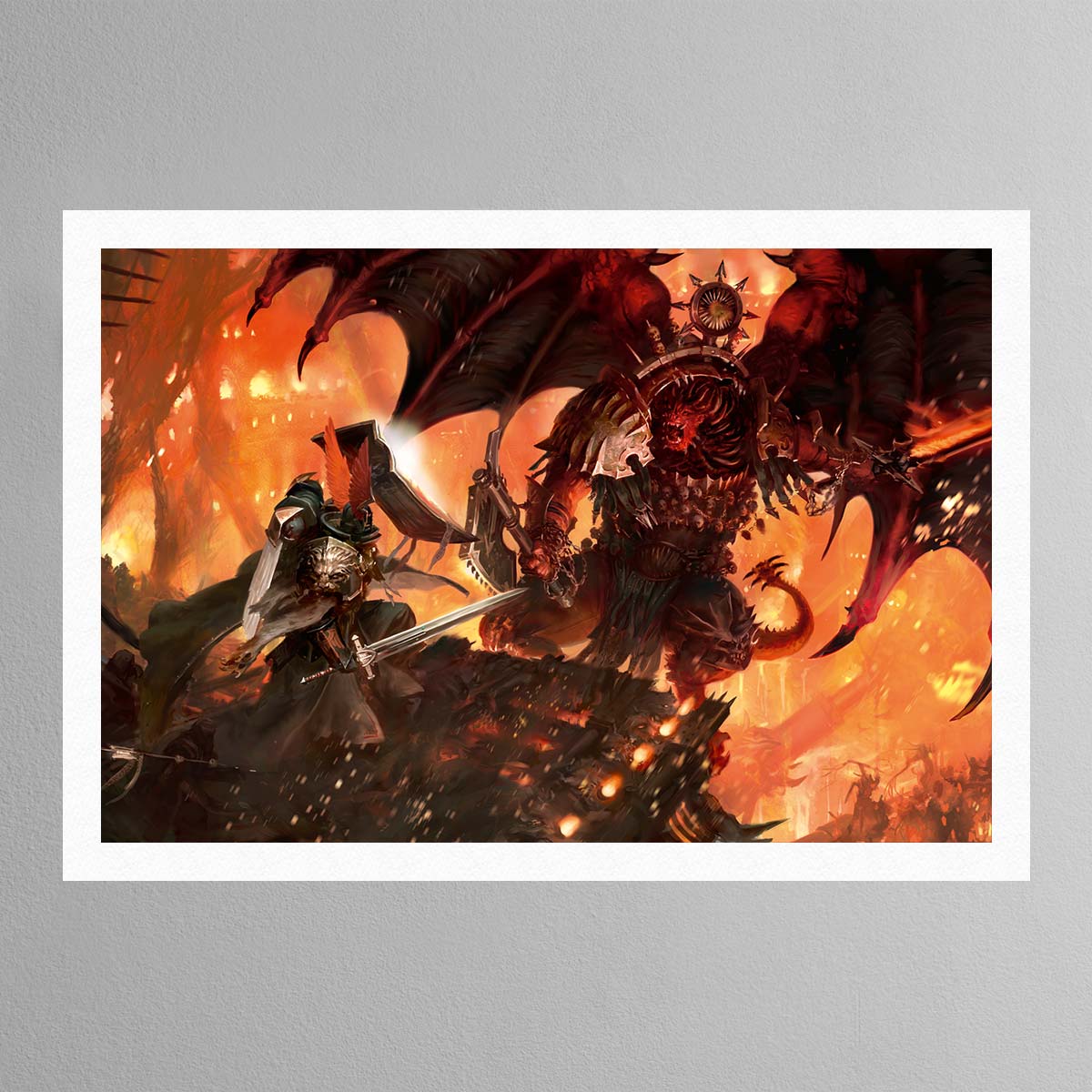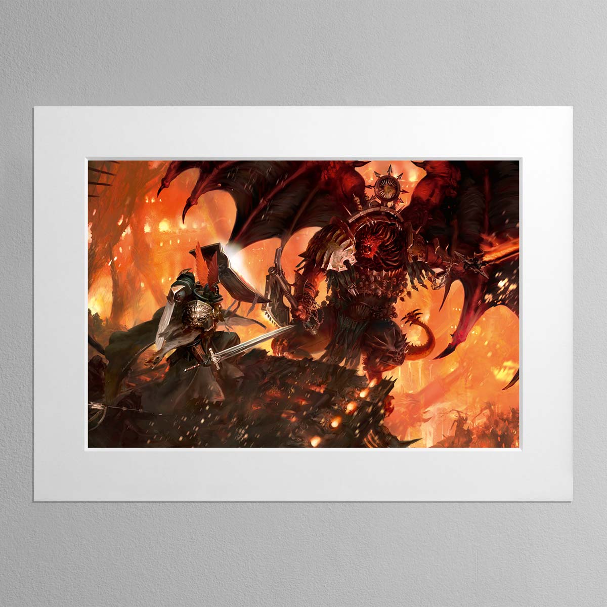 The Red Angel howled and launched himself at the Lion. Their mighty blades clashed again and again, sparks raining from each impact. The sword Samni’arius struck the Lion’s shield and rebounded in a concussive pulse of light and force. Back and forth across the tower top the two demigods battled, Angron raining a constant storm of blows upon his foe while the Lion demonstrated sublime martial skill in fending off or evading every strike. Flames and roiling mist whirled about the two combatants, tattering apart each time another shock wave burst from the Lion’s shield.