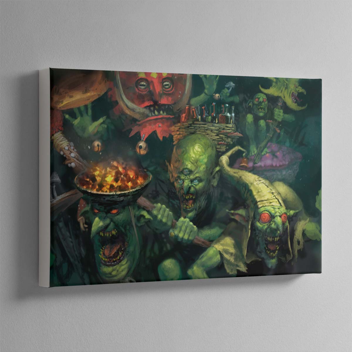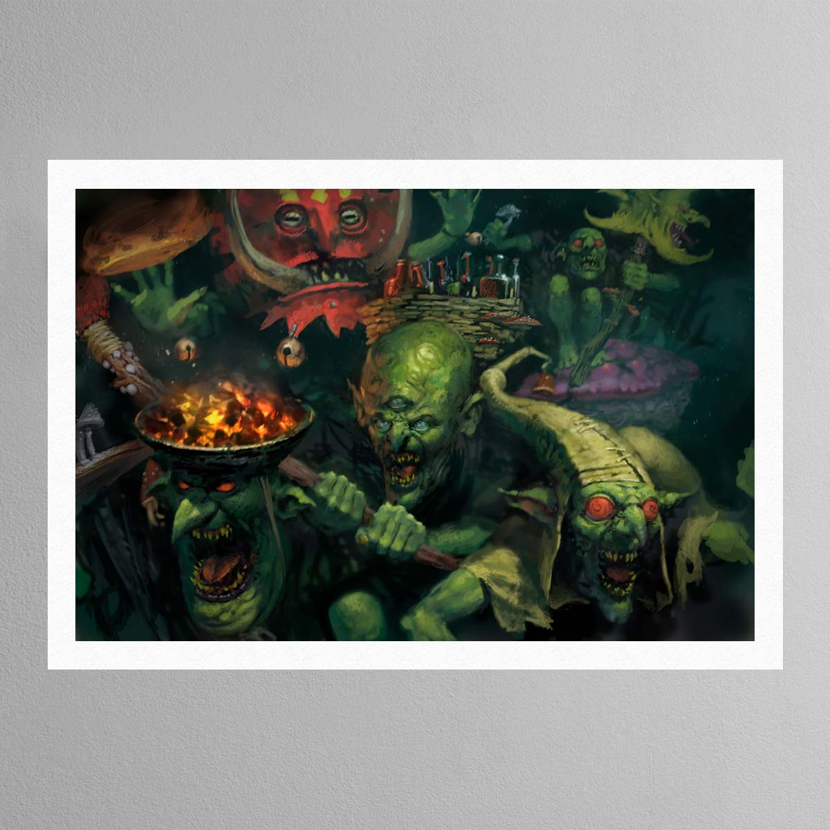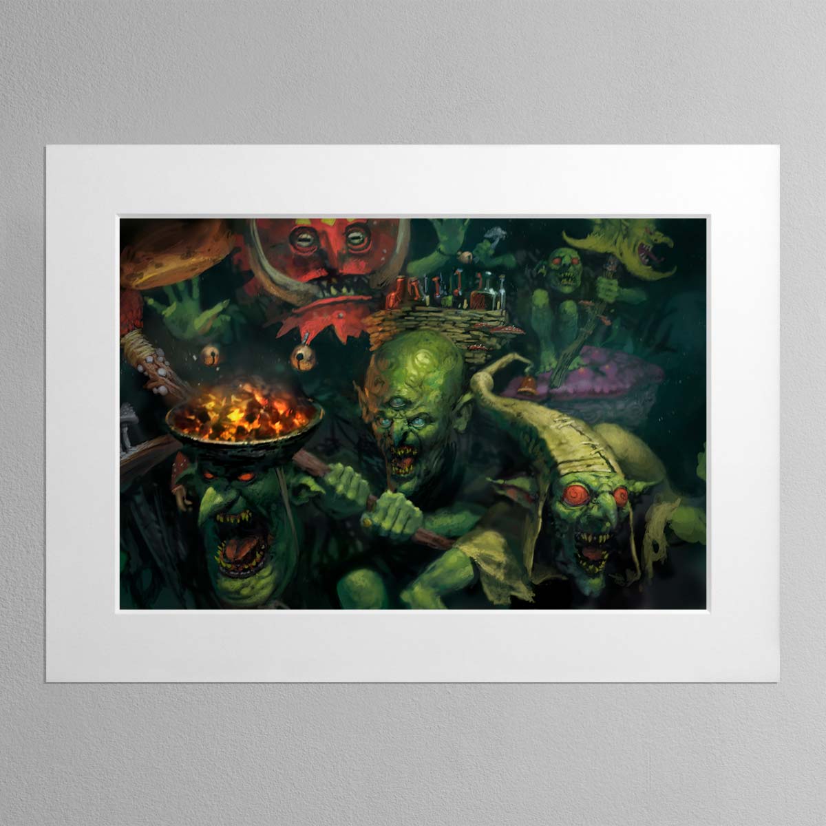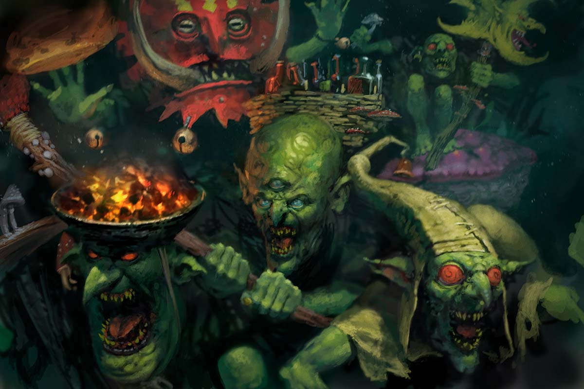 This piece by Phil Moss depicts the fungus-addled grots of a Gobbapalooza, complete with the twisted tools of their trade.