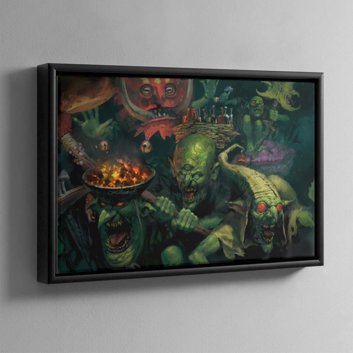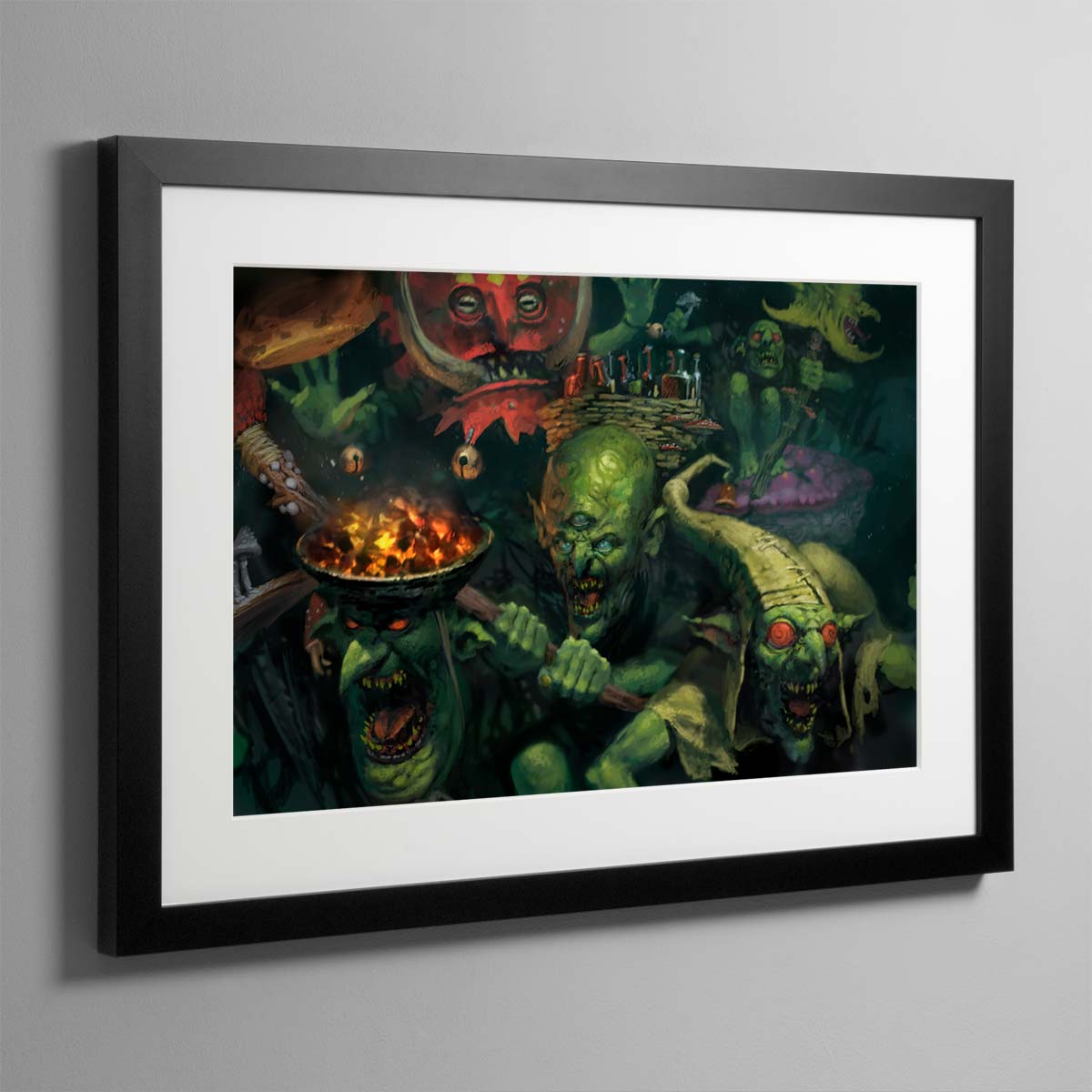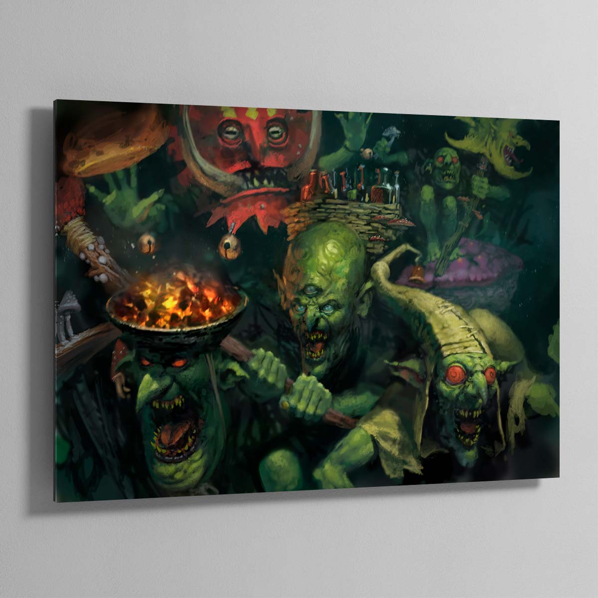 This piece by Phil Moss depicts the fungus-addled grots of a Gobbapalooza, complete with the twisted tools of their trade.