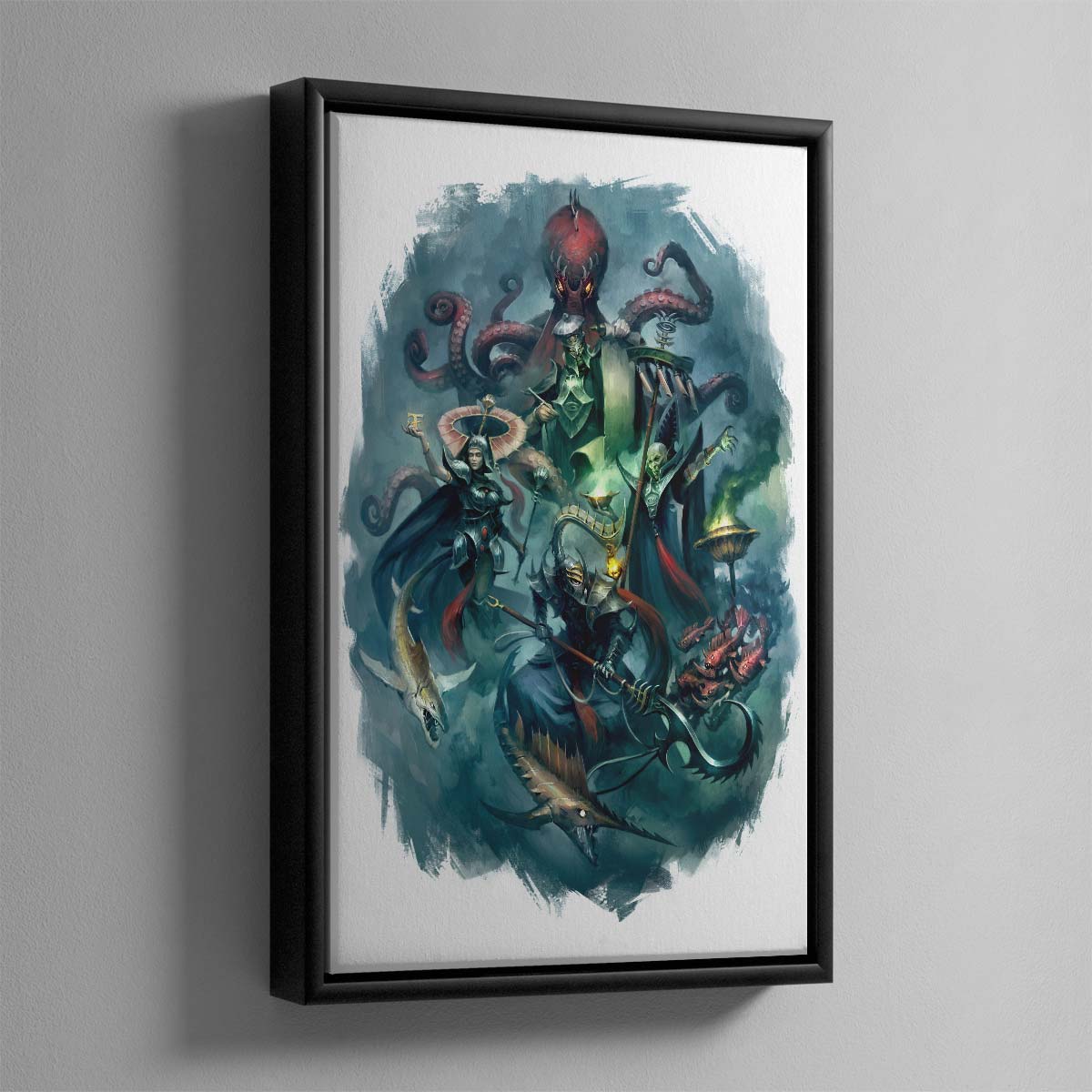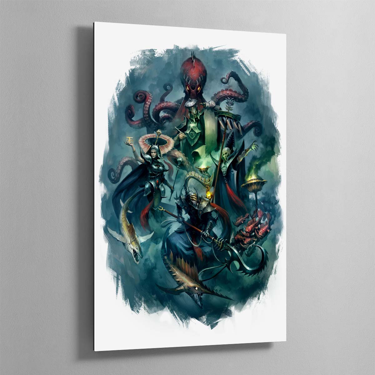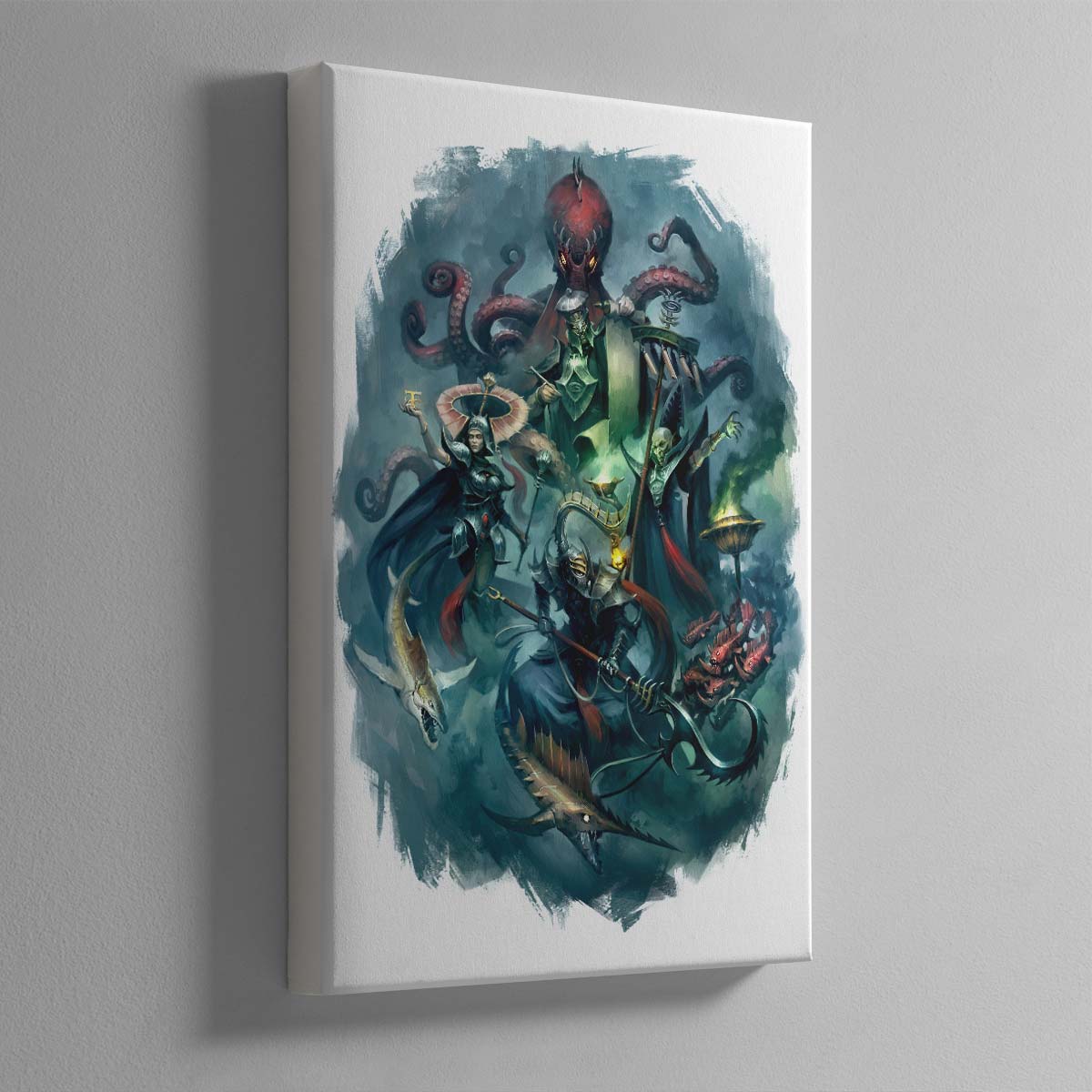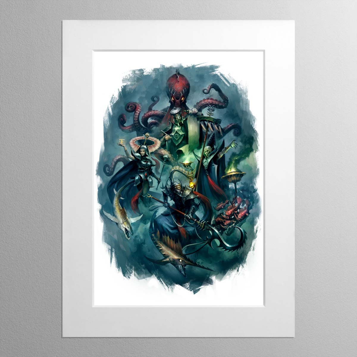 This illustration presents Lotann, Warden of the Soul Ledgers, a Tidecaster, Soulrender, and Soulscryer. Each are agents of the Isharann, a part of Idoneth Deepkin society with a talent for harnessing arcane forces. First published in Battletome: Idoneth Deepkin, released in 2018.