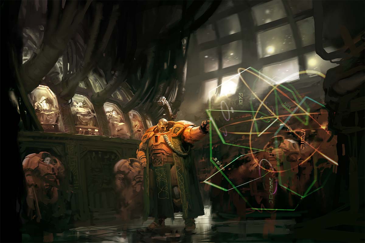 Every Hold’s Forge is unique, built and augmented over centuries to specifications determined by Votannic wisdom and personal Kindred preference. Yet in some respects they are uniform. All are sleepless hubs of activity, lit by the molten fires and searing plasmaarcs of technological manufacture, and all are filled with mechanisms of artifice ranging from Brôkhyrs’ personal A.N-vyl workstations, to colossal auto-foundries