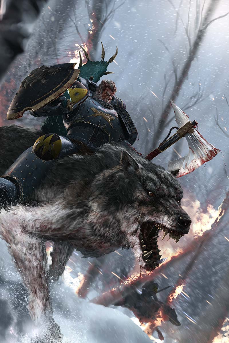 Harald Deathwolf rides to war atop his mighty Thunderwolf, Icetooth, with the howling hordes of Fenris at his back. His Great Company, the Deathwolves, is host to huge packs of beasts, from Fenrisian Wolves to hulking Thunderwolves.