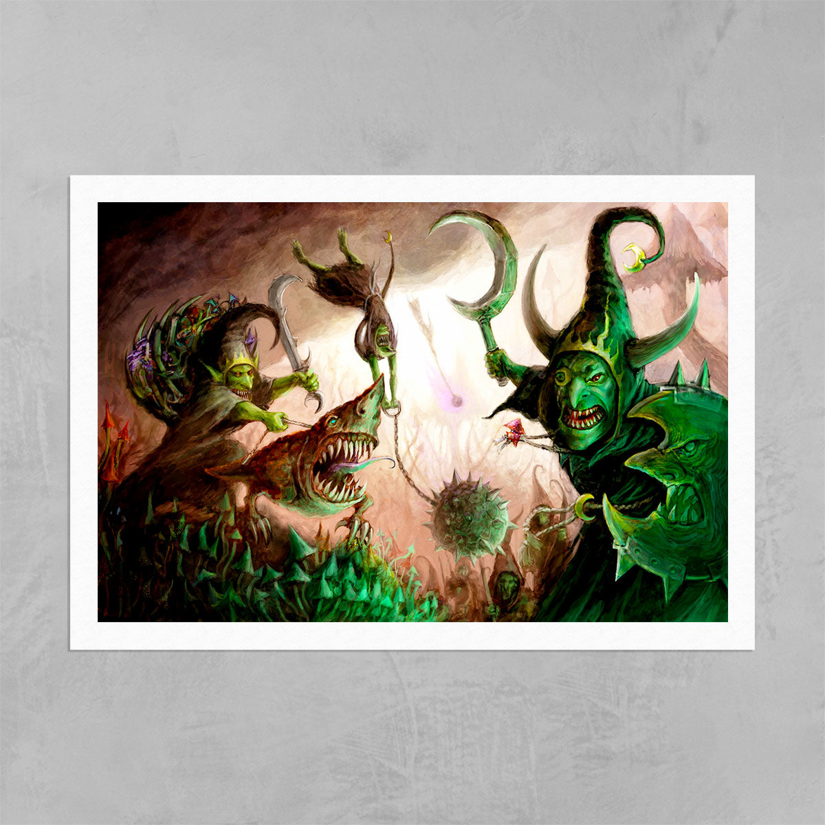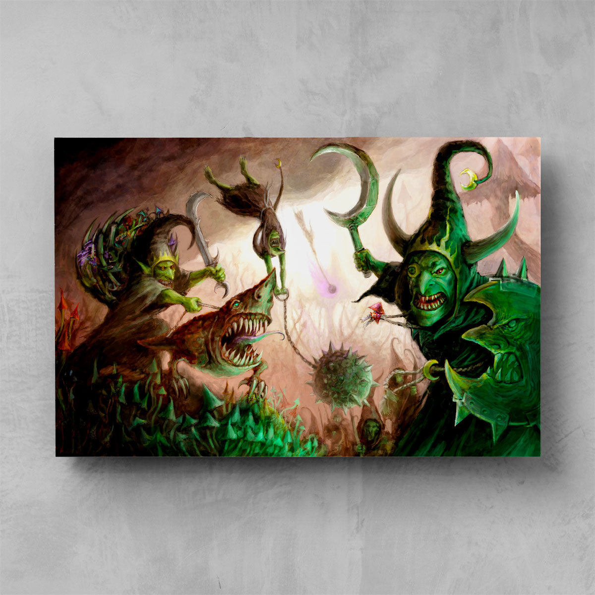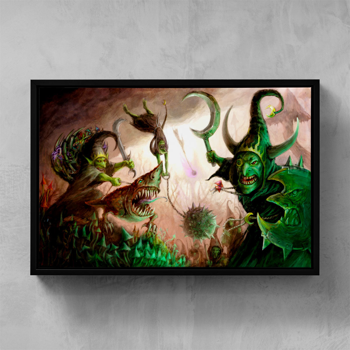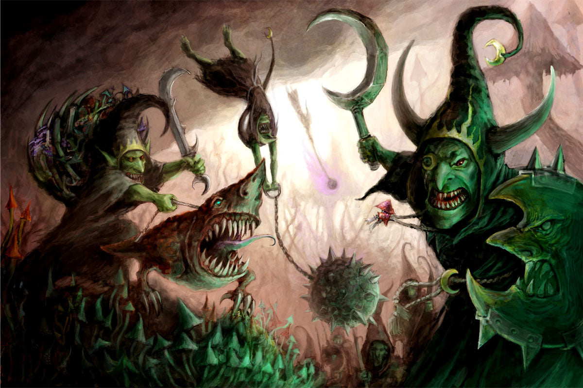 Moonclan Grots form ragged ranks that advance upon the foe with gongs clanging and banners waving. Eyes bulging with the madness of the Gloomspite, they pour over the enemy lines and stab wildly at everything in their path.