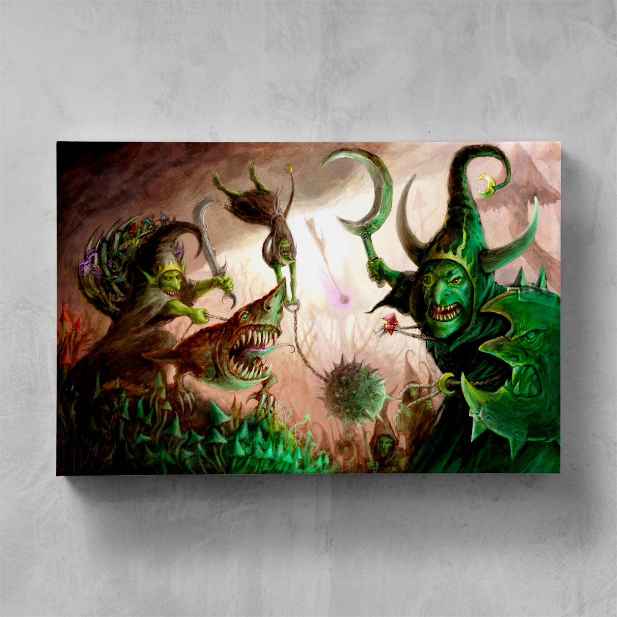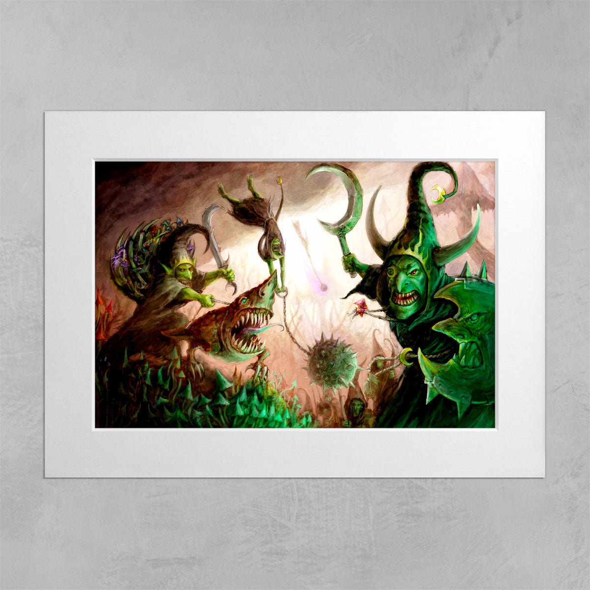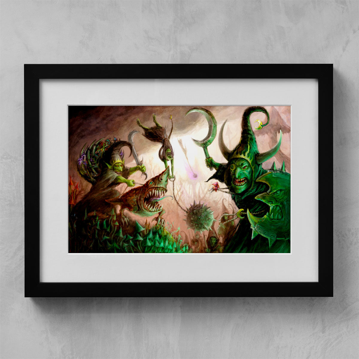 Moonclan Grots form ragged ranks that advance upon the foe with gongs clanging and banners waving. Eyes bulging with the madness of the Gloomspite, they pour over the enemy lines and stab wildly at everything in their path.