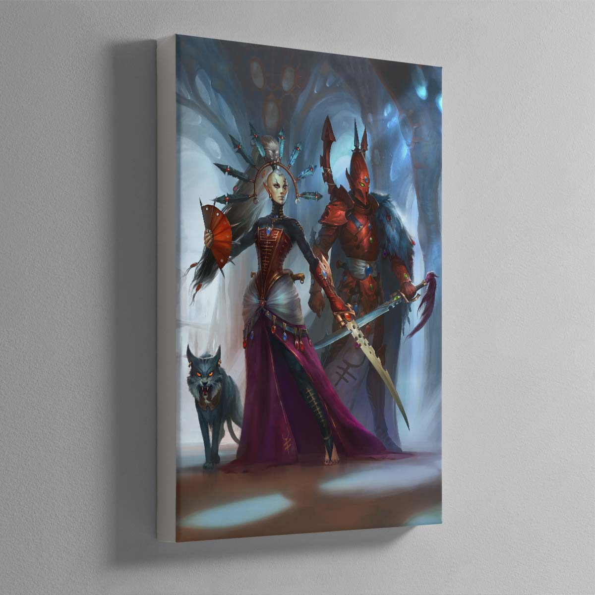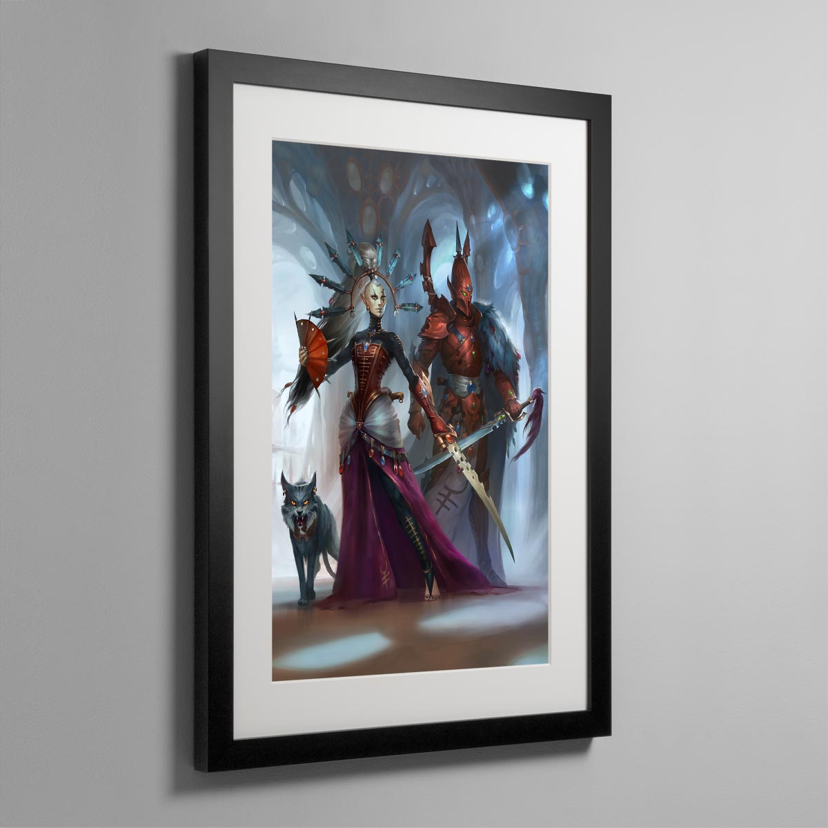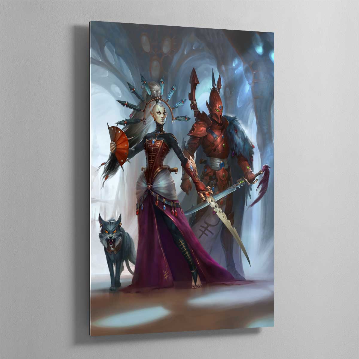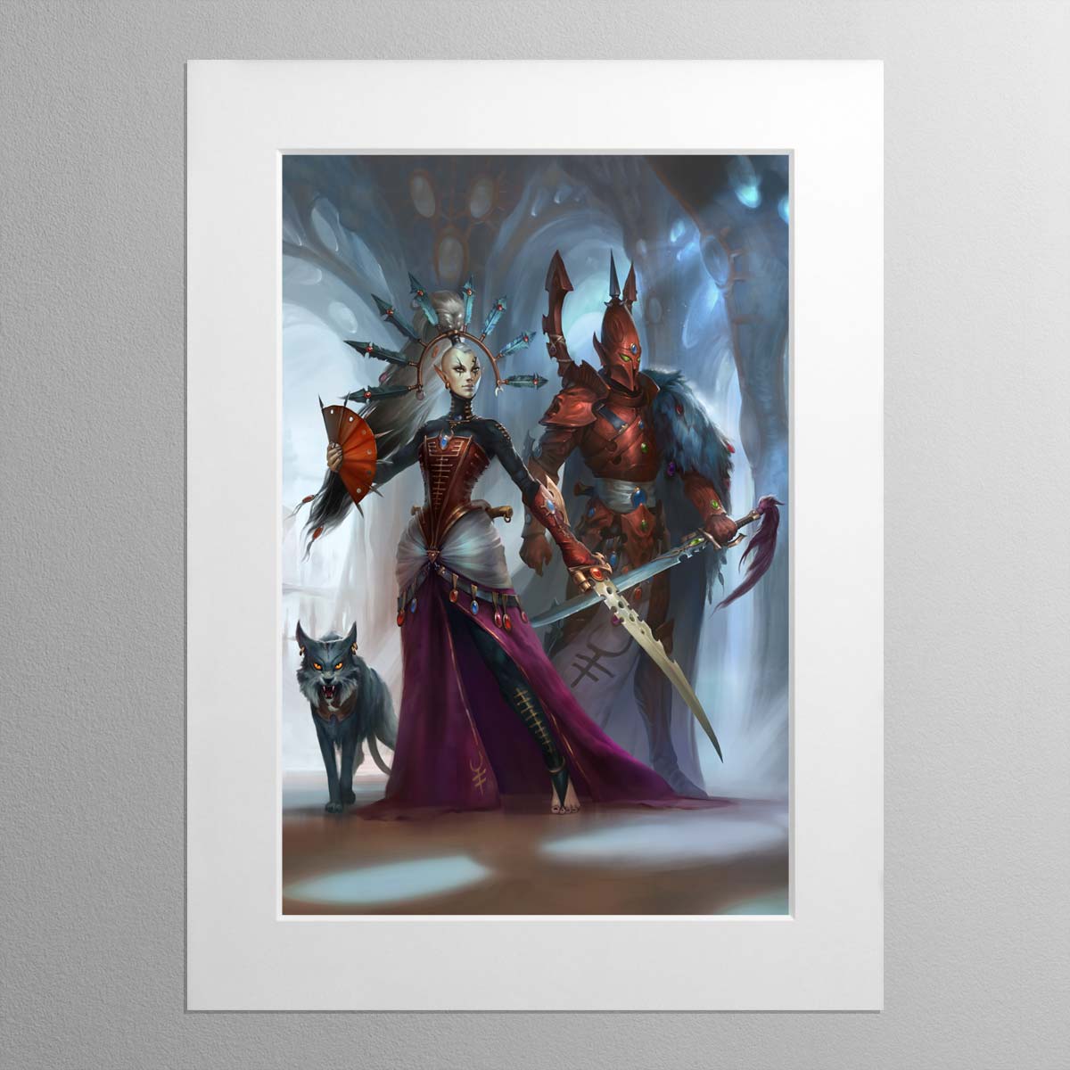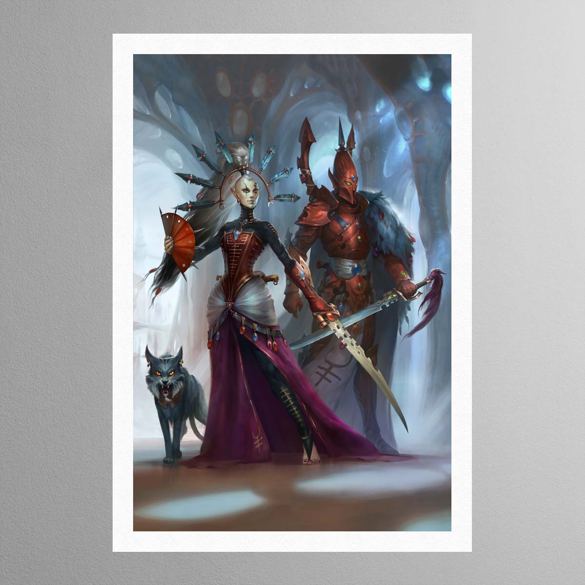 Yvraine, emmissary of Ynnead, treads the halls of Craftworld Ziasuthra with her most trusted warrior, the Visarch, at her side.