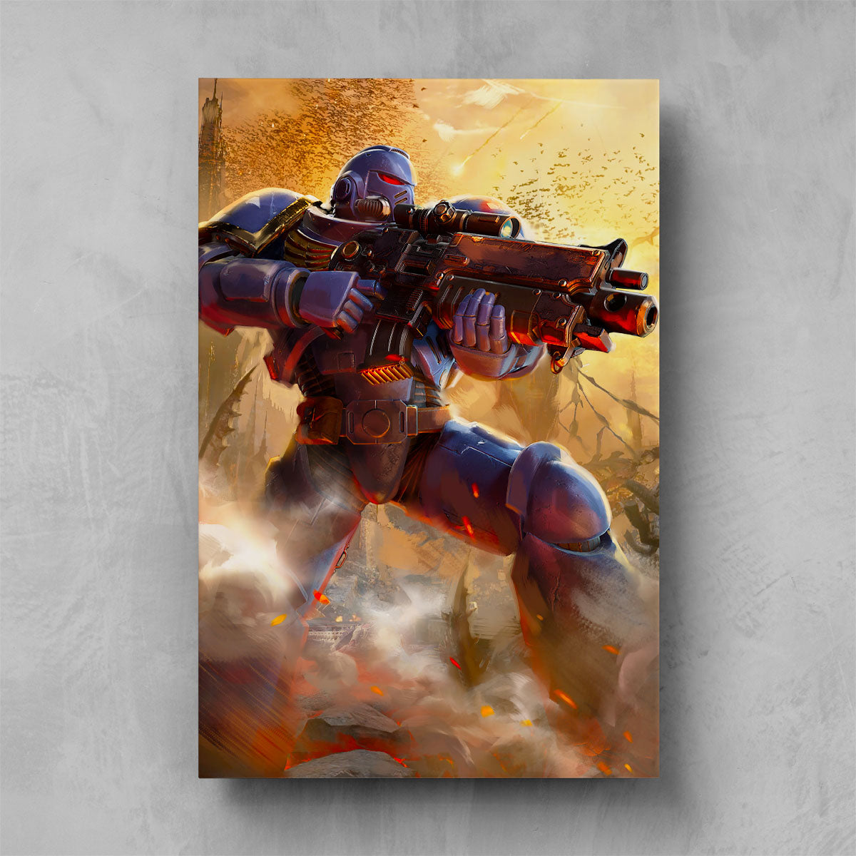 Artwork from the long-anticipated 2024 video game Warhammer 40,000: Space Marine II, developed by Saber Interactive and published by Focus Entertainment.