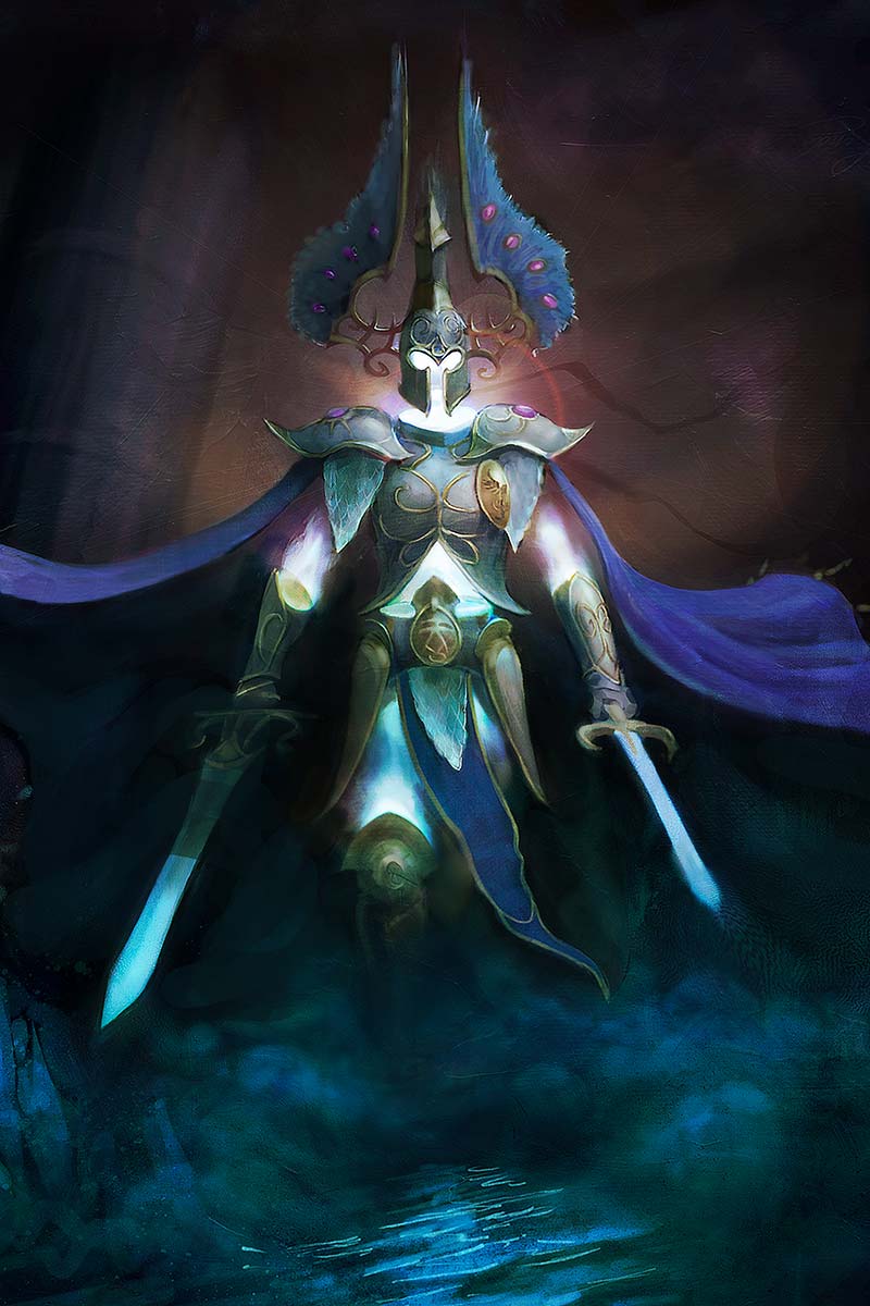 Eltharion has no physical form, only a spiritual essence given uncanny strength through Teclis’ magic. An ancestor of the Lumineth race, his avenging spirit is a puissant warrior and an inspiring hero to those Aelves who witness his shining light.